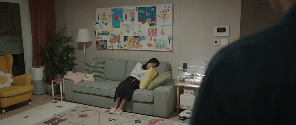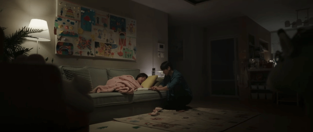 Ji-yoon can’t help but fall for Eun-ho. She continues to watch him cook in the kitchen and she’s impressed with his home-cooked meal. Eun-ho’s so good at cooking she wonders if he chose the wrong career. Haha. Ji-yoon isn’t one to eat much but she can’t stop eating Eun-ho’s food. She clearly enjoys it. Once they finish eating, they chat about Eun-ho and his cooking. How long has he been doing it? Eun-ho estimates that it’s been roughly about 30 years since he’s been cooking. 30 years of learning to live alone since he was in elementary school. Eun-ho throws out the question that he grew up well, right? Ji-yoon realizes how serious he is with his question and she showers him with support. Yes, he did grow up well. In response, Eun-ho reciprocates the same feelings back to Ji-yoon. Just like Byeol does to him as a sign of acknowledgement, Eun-ho places a stamp on Ji-yoon’s hand. She’s also done well. While Eun-ho steps away to answer a phone call from Byeol, Ji-yoon stays out in the living room and takes a good look around his apartment. She eventually knocks out on the couch due to exhaustion. Just like he did a few times before, Eun-ho takes care of Ji-yoon while she sleeps. He covers her with one of Byeol’s blankets, turns off the lights, and then retreats to his bedroom.