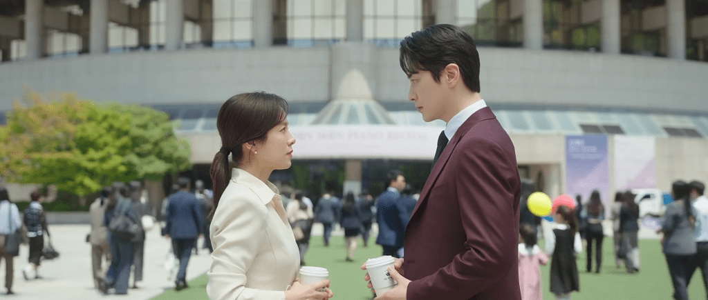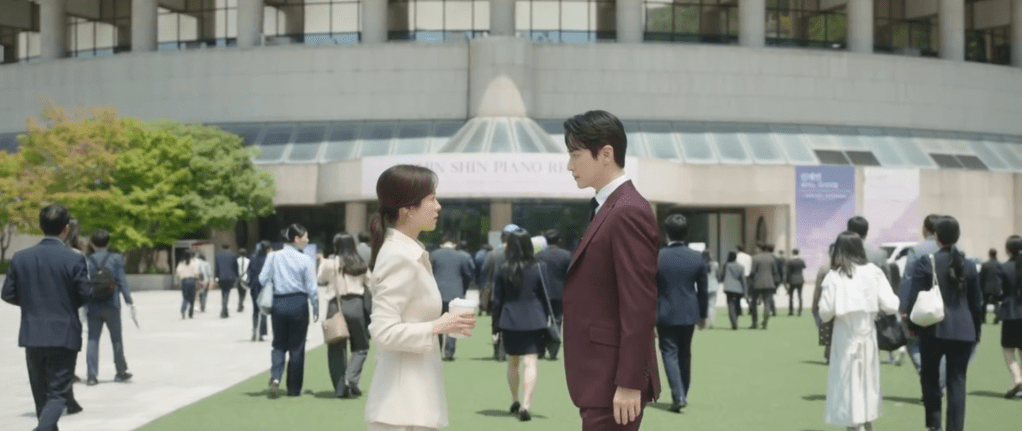 When Eun-ho finally does notice Ji-yoon, they stare at each other in silence as people walk towards the venue for the piano recital. Ji-yoon is reminded of Jung-hoon’s question about what Eun-ho means to her and she feels as if she knows the answer to that question now. They take a few steps towards each other and Ji-yoon hands over the cup of coffee that she had purchased for Eun-ho. Both of them are too shy to speak so they stand across from each other in silence, a cup of coffee in their hands and eyes glued to each other. Even though they’re surrounded by a crowd full of people, it feels as if they’re the only two people that exist in the world in this very moment.