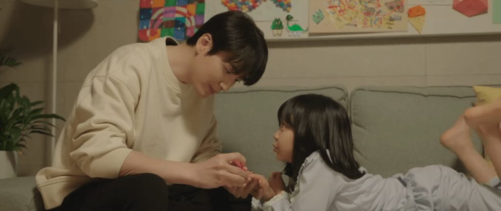 When Ji-yoon and Eun-ho reunite at work the following Monday, things are still awkward. Ji-yoon’s curious as to why he pushed her out of her apartment and if Byeol mentioned anything to him about her. The two bicker with each other. Haha. Meanwhile, Yeong-sook visits the Peoplez office and decides that she’d like to accept the name brand appraiser position. It’s great news for Kwang-hee and Eun-ho and Mi-ae and Ji-yoon are also content with the news. While having some lunch together, Mi-ae compliments Eun-ho for his role in Yeong-sook’s decision. So naturally, Ji-yoon grows curious about Eun-ho and his life as a single father. Mi-ae (AKA the person who usually has a wealth of information about everyone) reveals what she knows about Eun-ho to Ji-yoon. He married his ex-wife right after college but they divorced before Byeol turned one. Then he took parental leave to take care of Byeol who wasn’t feeling good at the time. This aligns with what Eun-ho told Ji-yoon when they had lunch a few weeks ago and Ji-yoon acknowledges that Eun-ho indeed is a great father. Mi-ae grows suspicious of Ji-yoon’s interest in Eun-ho but Ji-yoon pretends as if it’s nothing. She’s just expressing interest in her employees like Mi-ae told her to do. That’s all there is to it. Riiiiight. Speaking of Eun-ho being a good father, he spends more bonding time with Byeol. She wants him to paint her nails and give her a manicure so that she can show them off to the lady in the Dodam Bookstore next time, hehe. So Eun-ho and Byeol paint each other’s nails and they head to sleep after.
