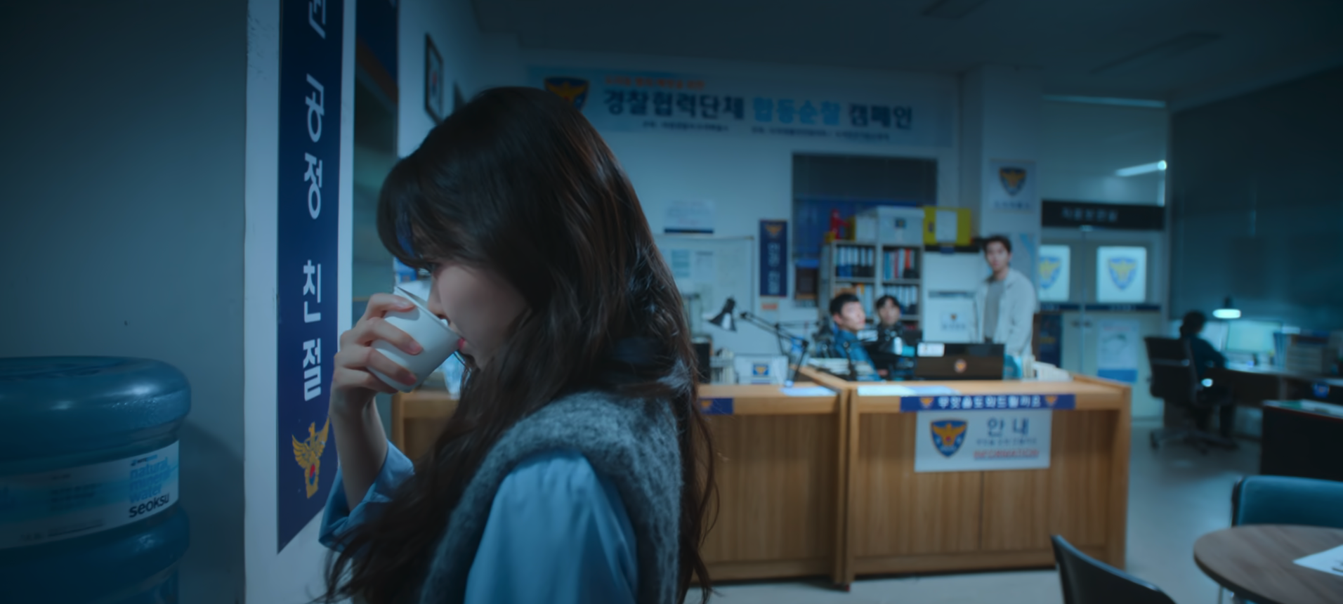 While walking home from the convenience store, Gyeom catches Moo-bi stumbling out and about since she’s had a little too much to drink. He doesn’t want to bother her so he silently follows after her to make sure she gets home okay. The only thing is.. he’s stopped by two police officers who assume that Gyeom is a dangerous man following after an intoxicated woman. Gyeom is more concerned with getting caught by Moo-bi so he volunteers to leave with the police officers to the police station. LOL. Moo-bi notices the small commotion from behind her but she can’t quite pin exactly who it is or what’s happening. When Gyeom arrives at the police station, he defends himself and argues that he’s innocent. He was following Moo-bi out of concern for her and he lives right across the street from her. The police officers aren’t buying his story and it seems like all hope is lost for Gyeom. But thankfully, the sound of the water jug in the police station catches Gyeom’s attention and he’s relieved to find Moo-bi standing there to get some water to drink. She’s there to bail him out (I remember being sooo in love with this scene! For some reason, it’s so darn heart-fluttering and cute!! I loved the way Moo-bi came back for Gyeom <3).
