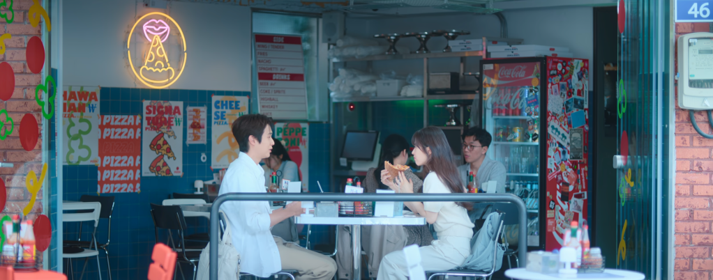 The reason why Gyeom called Moo-bi during her meeting with Joo-Ah was to invite her out for some pizza. He’ll be waiting at the pizza joint in their neighborhood. If Moo-bi happens to be there, she can either just walk by and ignore him or she can choose to join him. So Gyeom waits and waits at the pizza joint for Moo-bi and just when it seems like all hope is lost, Moo-bi shows up to join him (EEEEK!). Wow, what a small neighborhood! What a coincidence! Who would have known that Moo-bi would see Gyeom at the pizza joint? Haha. So she munches on her Hawaiian pizza (which Gyeom is not a big fan of) and Gyeom eats his pepperoni pizza. He hopes that they can run into each other more often from now on.