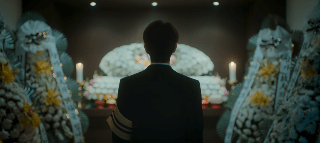 Gyeom stares at his brother’s portrait while at his brother’s funeral. It hurts to lose his brother but Gyeom isn’t crying. Perhaps it’s still all too much for Gyeom to process. Perhaps he’s in shock. Or perhaps it’s because he had already prepared himself for this in a way. Maybe he already had a feeling all along. Gyeom may have gotten his happy ending with Moo-bi but his brother’s story concluded differently.