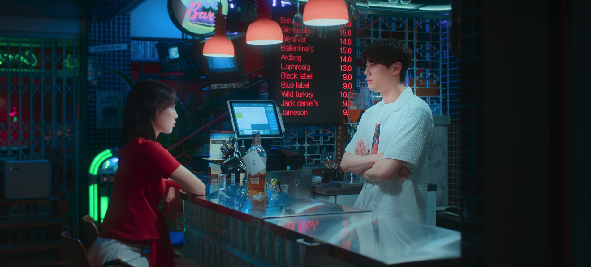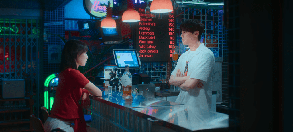 Joo-Ah stops by Vide Bar to spend time with Si-joon. Joo-Ah learns that Si-joon still hasn’t contacted Gyeom and she encourages him to reach out. Even if he’s not good with words, he can still stay by Gyeom’s side. Gyeom will understand. But Si-joon’s worried that his words will come off as harsh and he’s unsure as to how to comfort Gyeom. Joo-Ah disagrees with Si-joon’s sentiment and notes that it’s not all like that. Sure, he can come off a bit rude at times but he’s sincere. They spend the rest of the time drinking some alcohol out of a bottle that belonged to a couple. It’s been a year since the couple has returned to the bar so Si-joon assumes they won’t come back for it. There’s plenty of other couples with their own bottles of liquor at the bar that never returned. So Joo-Ah makes a bet with Si-joon that one of those couples will return to the bar soon. They then go on to chat a bit about Joon and reminisce their memories with him (this scene was soooo beautiful and heartfelt and sincere. I loved it so much).