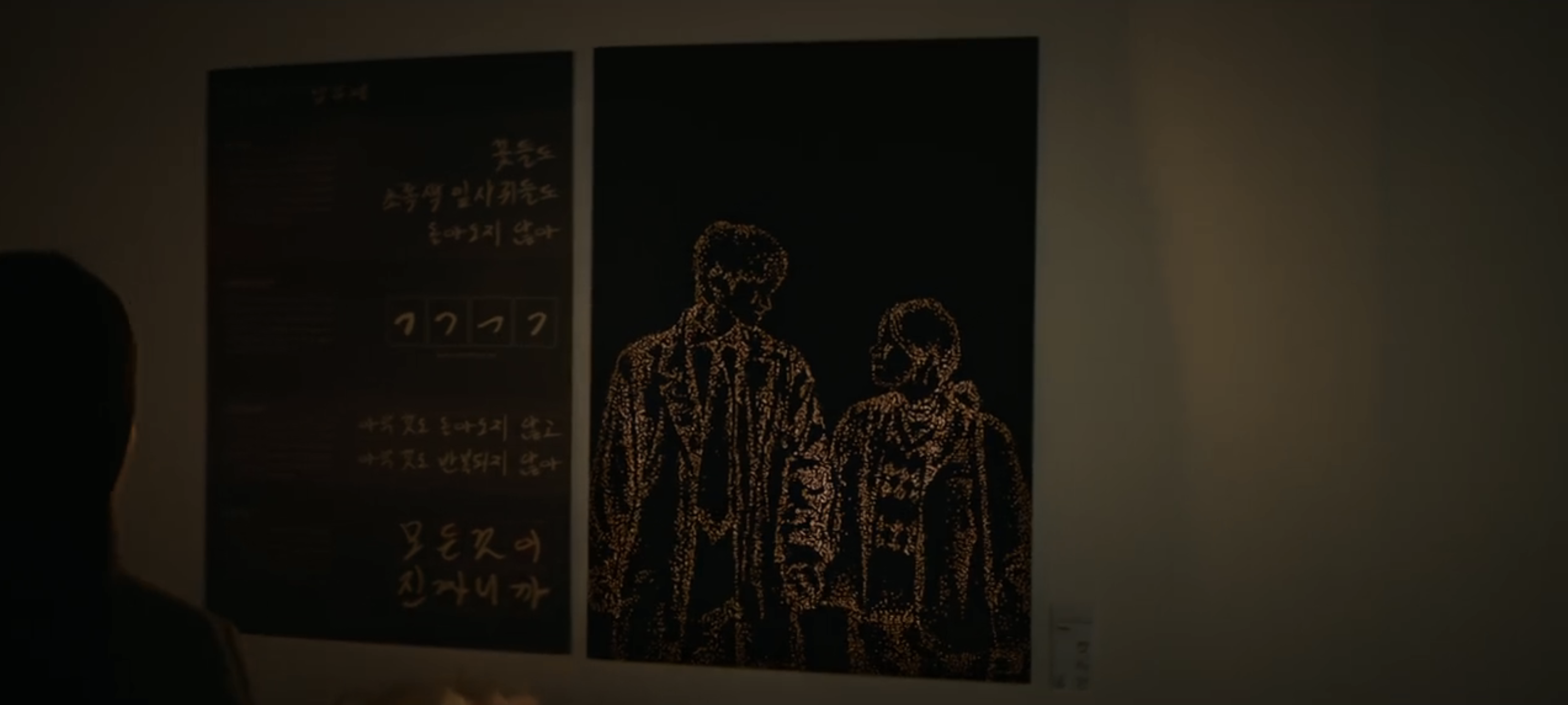 Hee-wan is seen video calling Tae-kyung who now lives in Hawaii. She also spends time with her dad and sister. And lastly, she rushes to her graduation exhibition for her college department. Hee-wan’s dad and sister arrive at the exhibition to congratulate her and then Hee-wan studies her art pieces one more time. She commemorates Ram-woo by dedicating one of the pieces to him: it’s a poem written in his handwriting (she used his handwriting from the letter that he wrote for his mom back in high school). The poem reads,